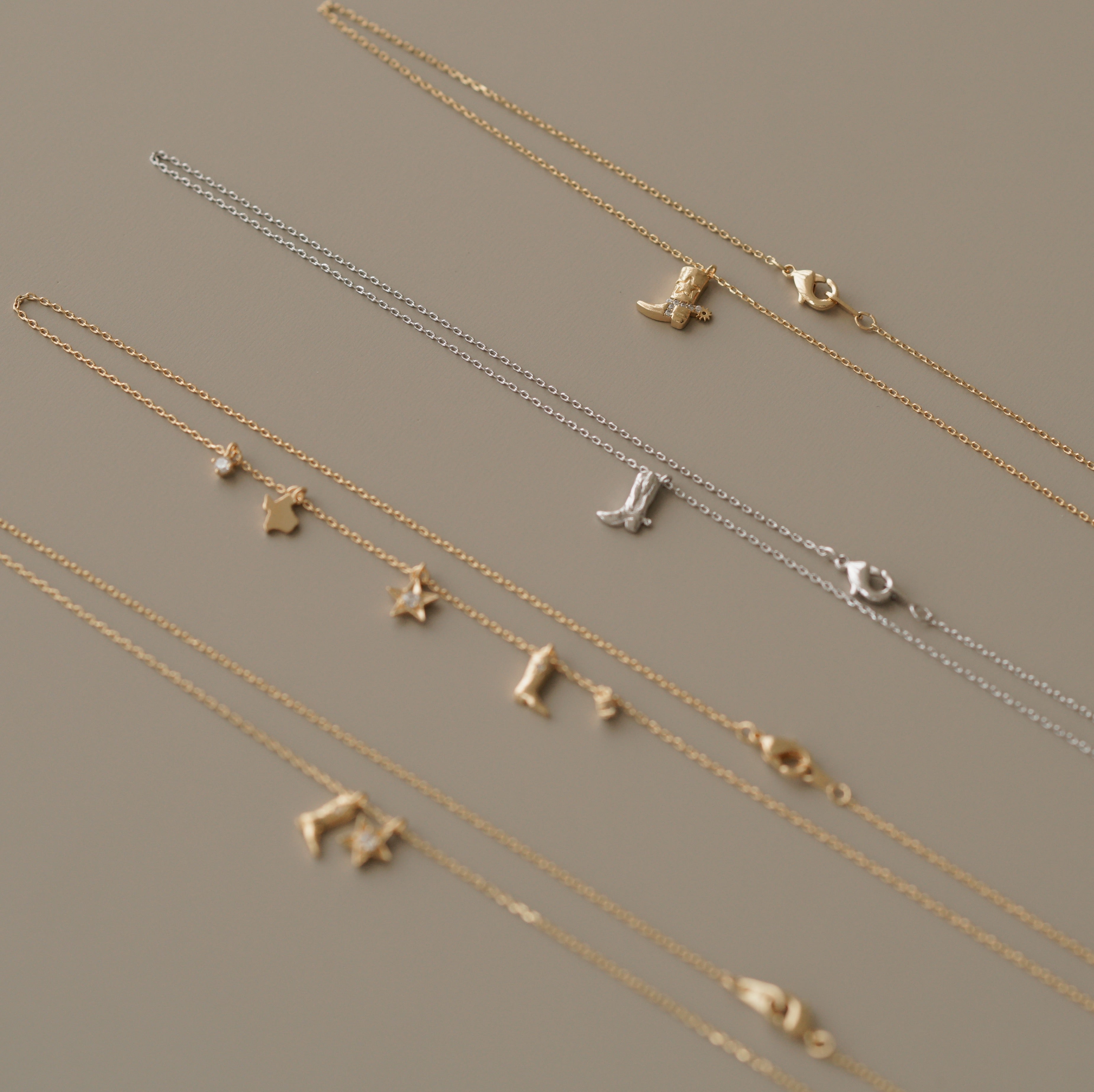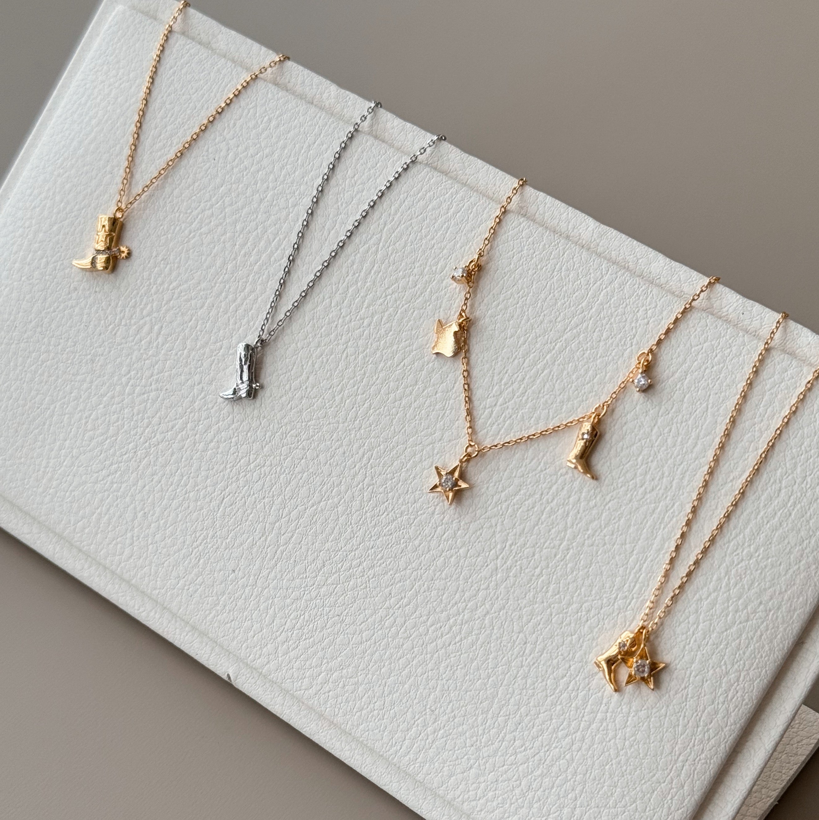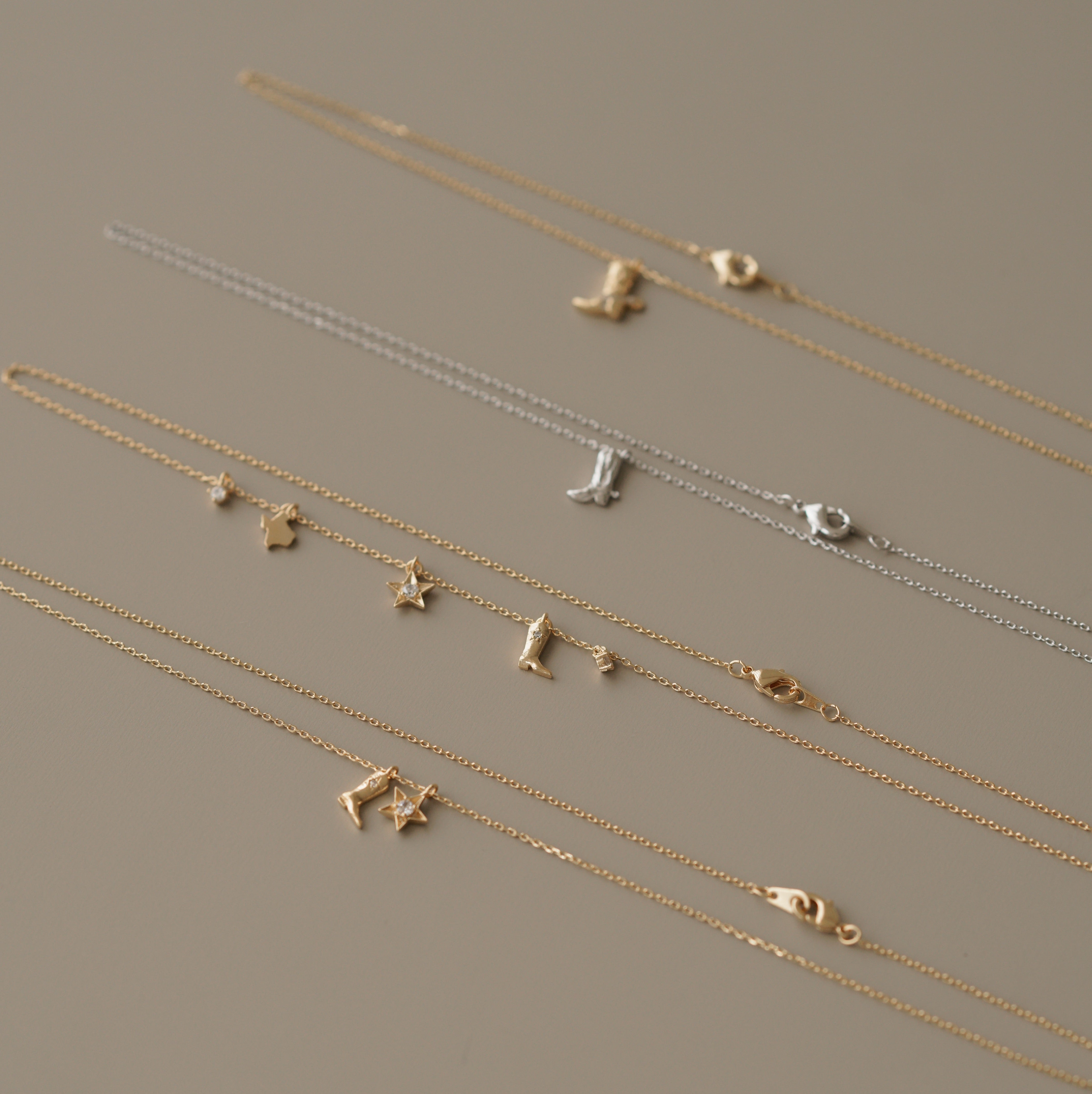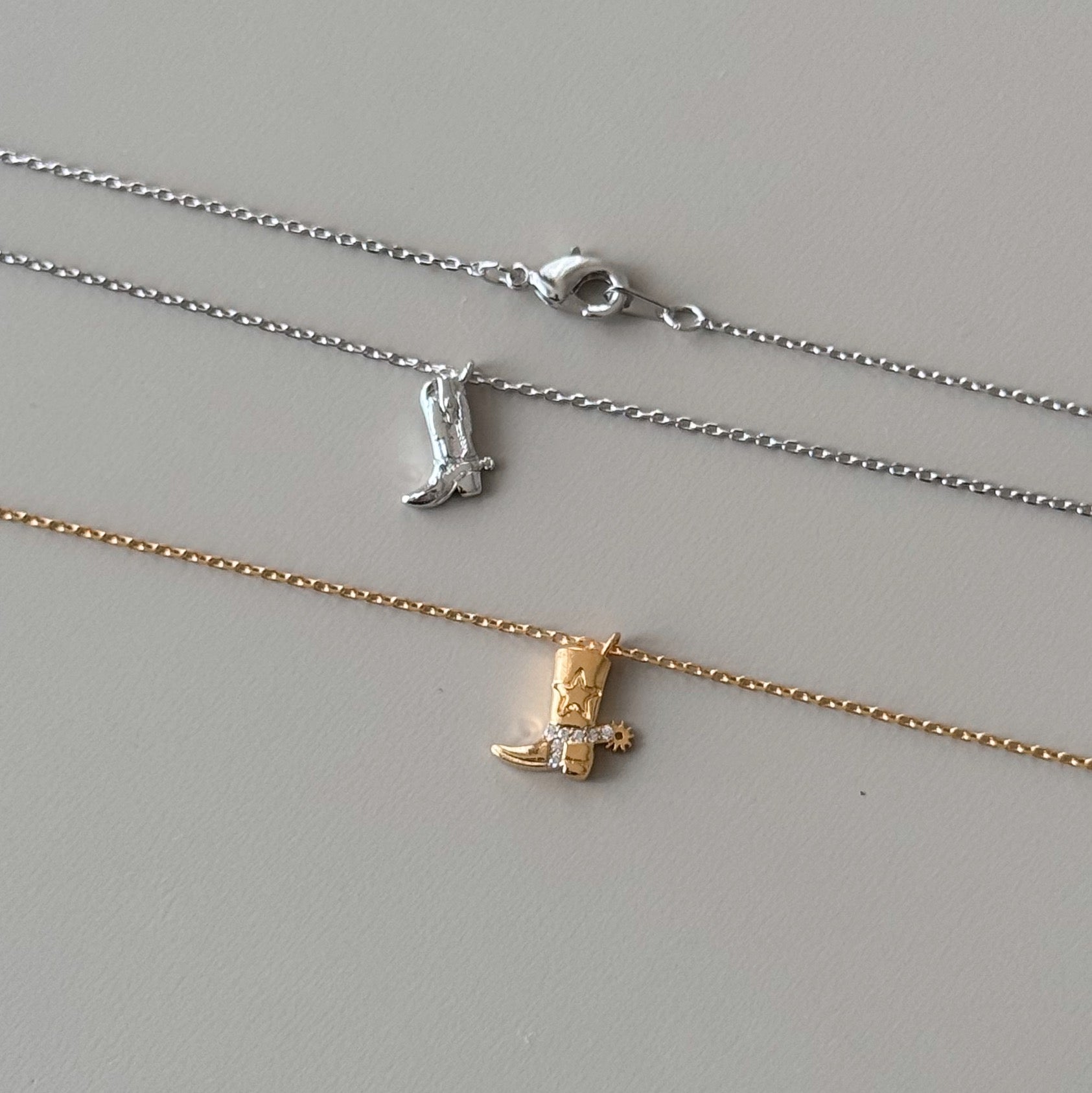 Wrangler Necklace comes in gold or silver, both a little different. It is designed after the cowboy boot.