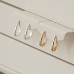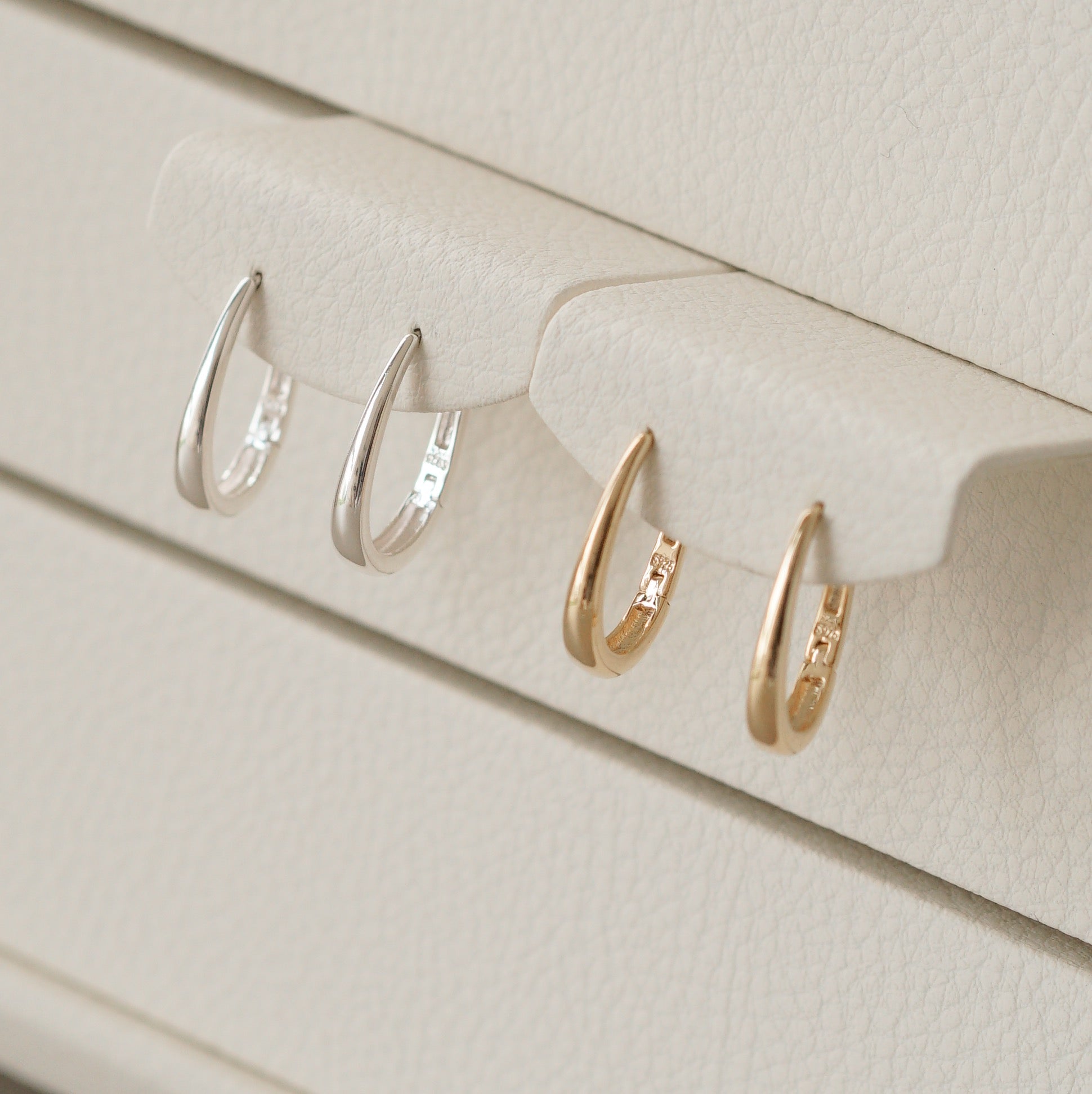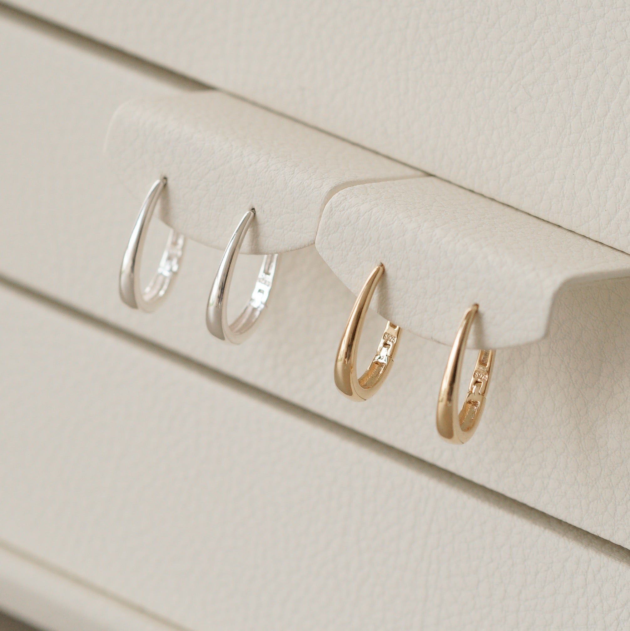 We have a couple of everyday hoops in this collection, all serving different purposes. Our Eva hoops is the biggest size of all the hoops we have. It’s a tapered oval shape, available in gold and silver.