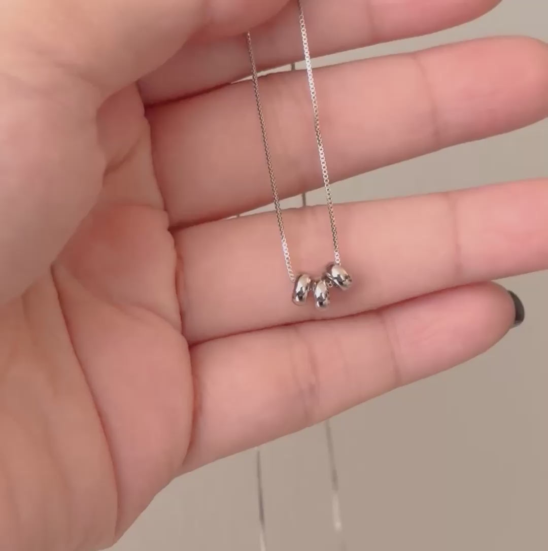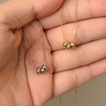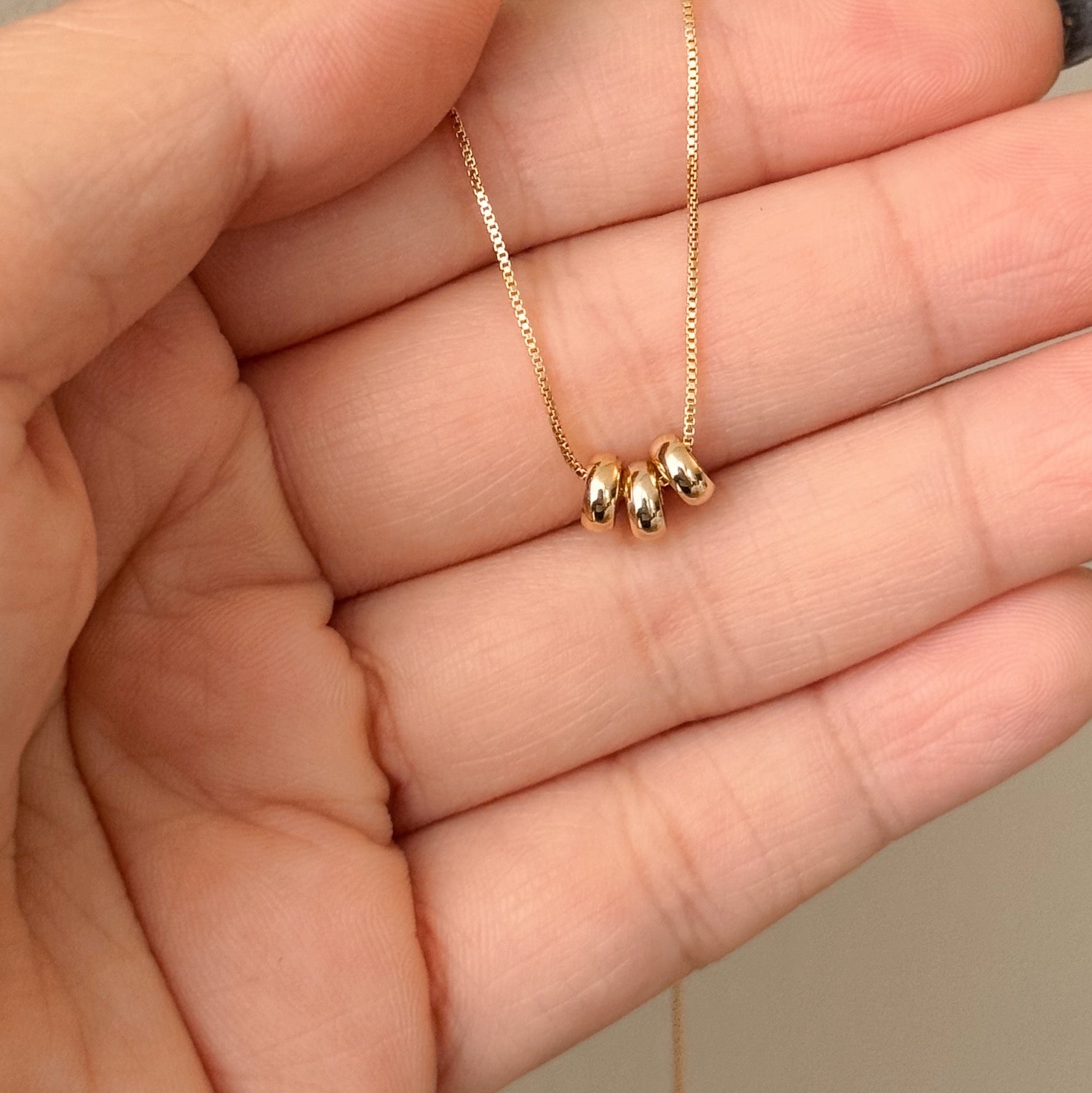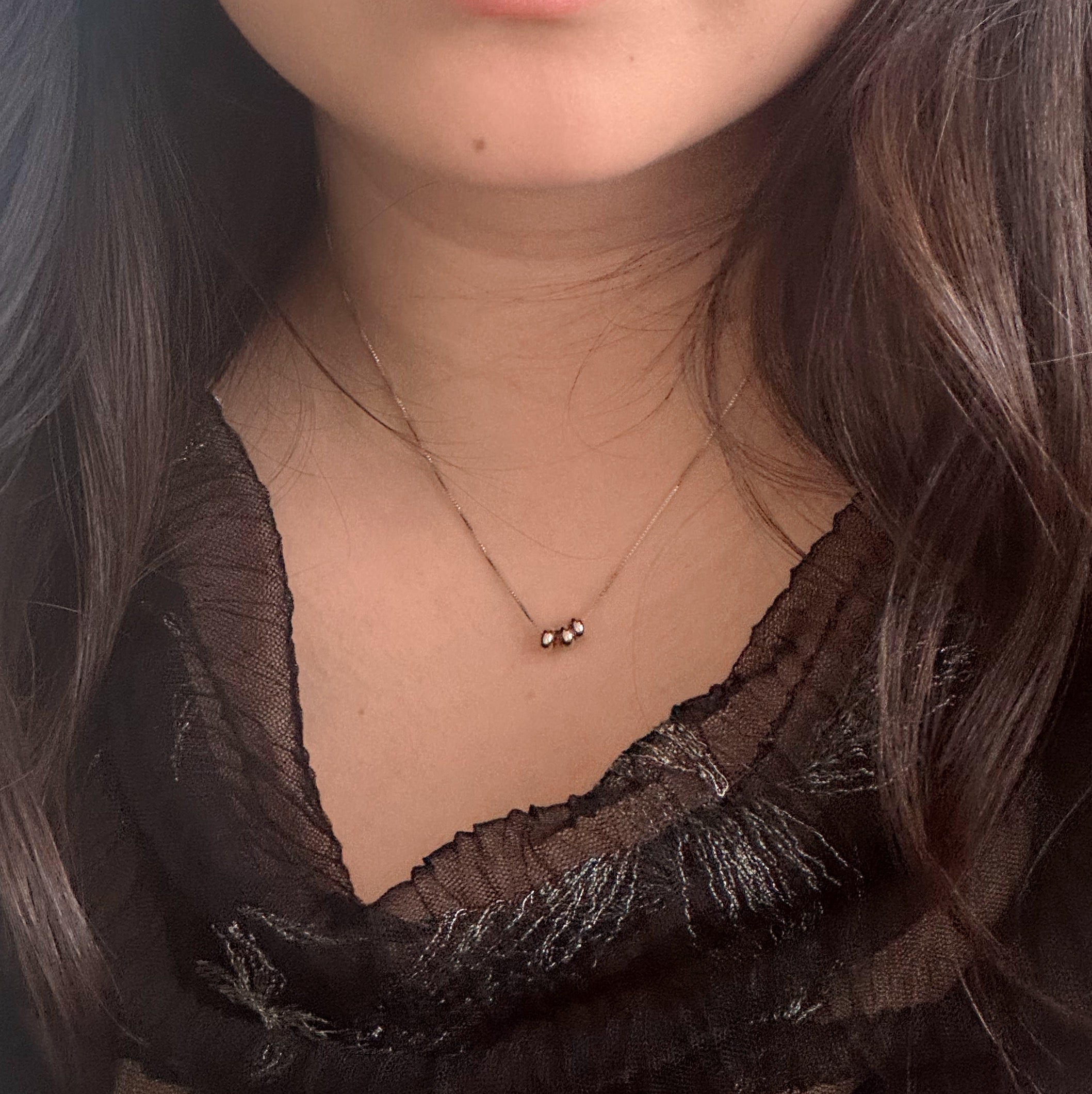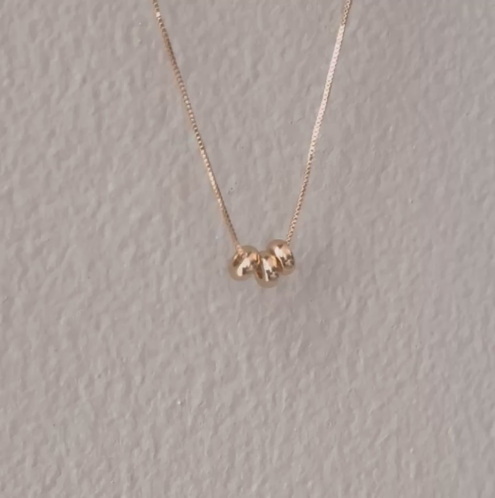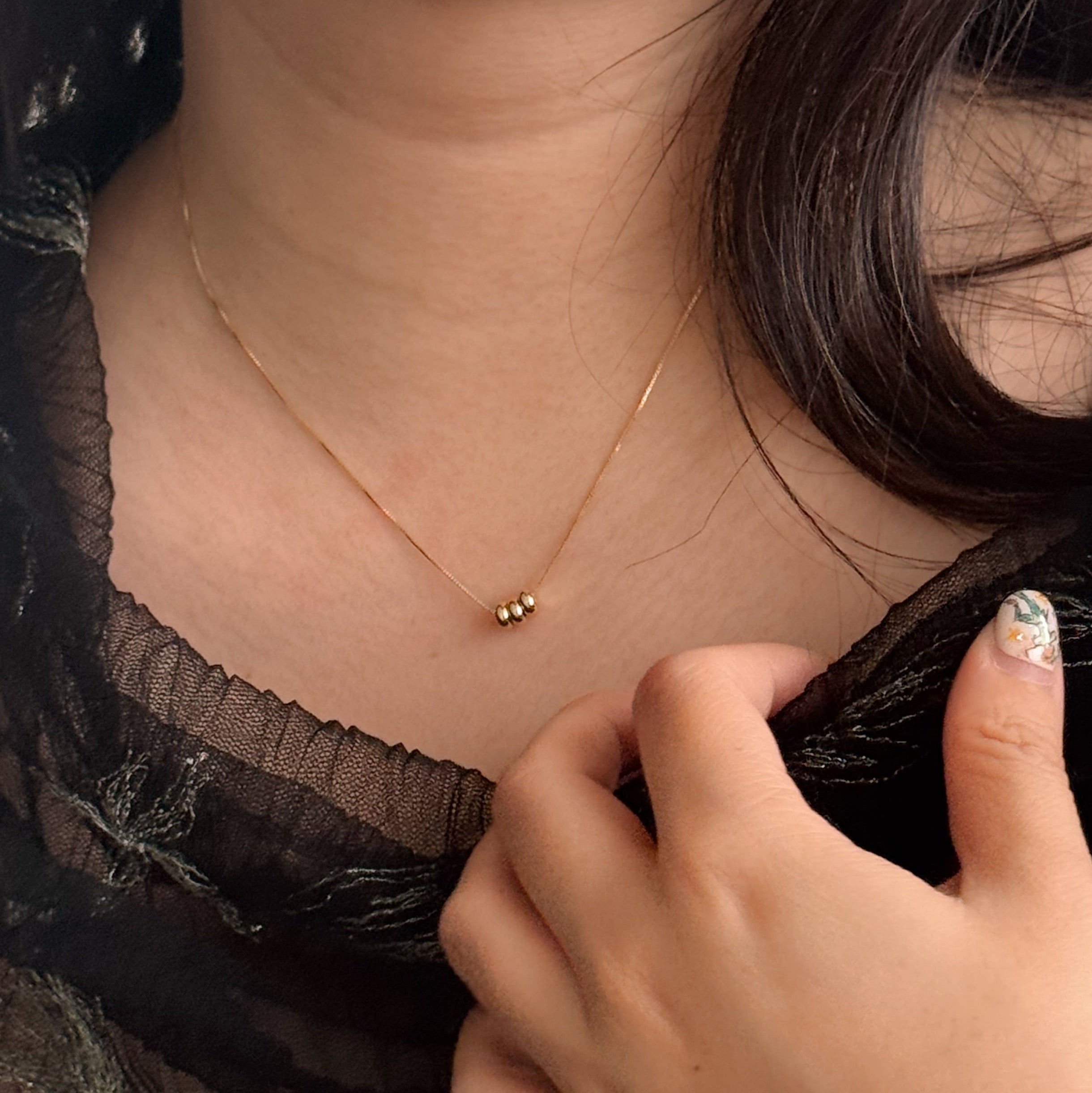An everyday necklace showcasing a minimalistic design with three small beads, depending on the color of hardware you choose. Lightweight and made for everyday.